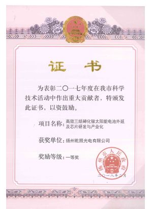 日前,揚州市政府公布了2017年度科學技術獎獲獎情況。揚州乾照光電有限公司申報的“高效三結砷化鎵太陽電池外延及芯片研發(fā)與產(chǎn)業(yè)化”項目,在眾多優(yōu)秀成果中脫穎而出,榮獲揚州市科技進步獎一等獎。