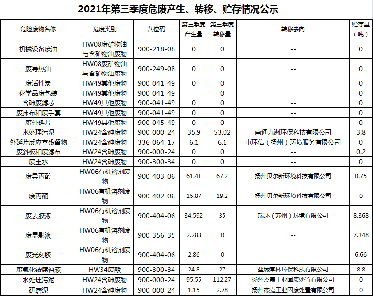 揚(yáng)州乾照光電有限公司2021年第三季度危廢產(chǎn)生、轉(zhuǎn)移、貯存情況公示